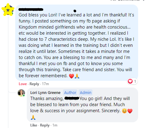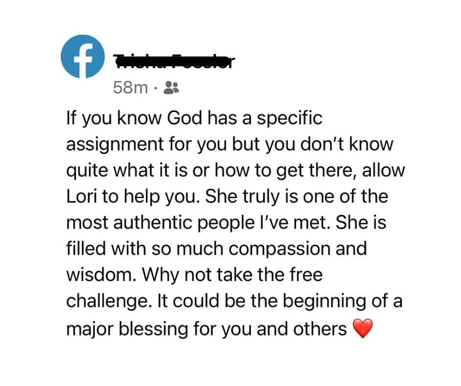 "Hey Friends, Lori Lynn Greene is the real deal! Spirit led, insightful, delightful certified Christian Life Coach. I met her in a recent challenge. Things are breaking off of me...I invested in the offer...I think it would benefit you doing likewise."
